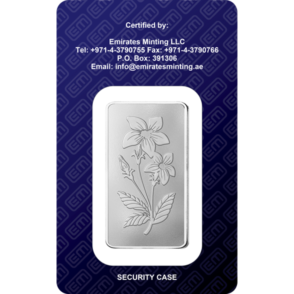 This fine silver bar from Emirates Minting is crafted to high refining standards and guaranteed 999 purity. Featuring a clean minted finish, it is a trusted choice for investors looking for high-quality UAE-produced silver.