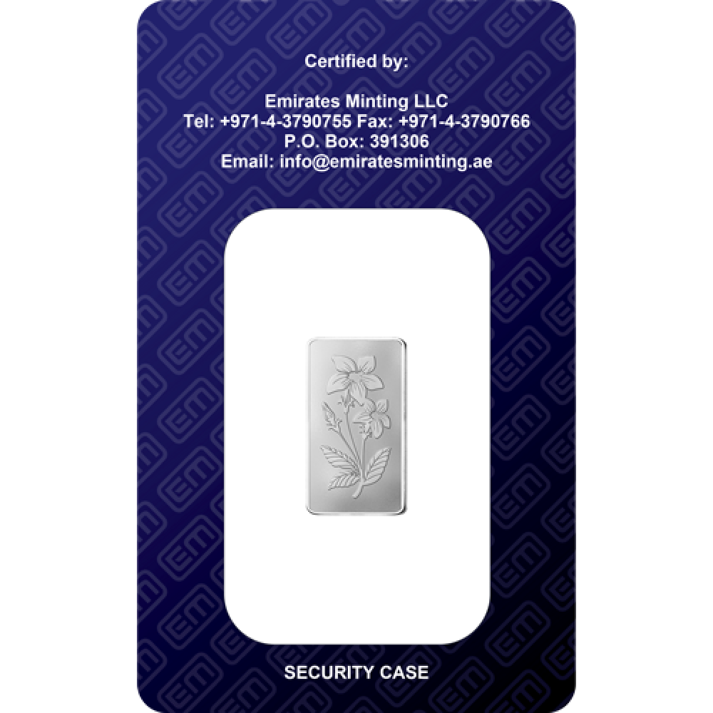 This fine silver bar from Emirates Minting is crafted to high refining standards and guaranteed 999 purity. Featuring a clean minted finish, it is a trusted choice for investors looking for high-quality UAE-produced silver.